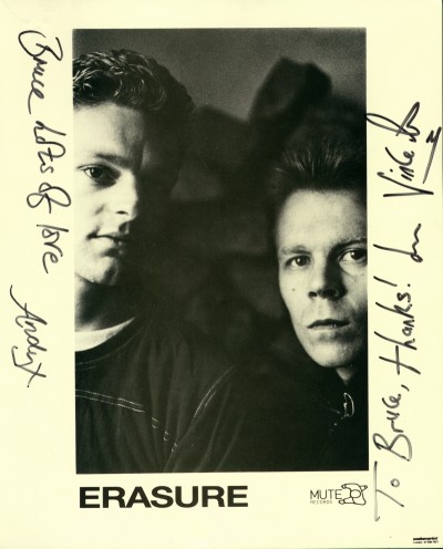 Erasure Pics![]() Signed photo when "Wonderland" was released, no tour of the US yet. ![]() Backstage at Numbers in 1997. They did 6 club shows I think before a huge tour of Amphitheaters. This was the tour for "Cowboy". Andy and Vince looking quite happy about it all. They had played Numbers back in 1986 and I had already met them at least 4 times by now. Nice people and Vince is a genius! More Pics |